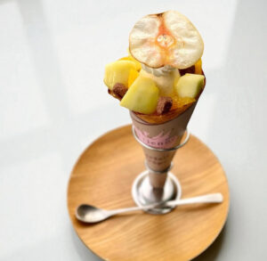 もちもちクレープ生地に今が旬のフレッシュの洋梨アクセントに爽やかなオレンジソース洋梨のチップがデコレーションする季節限定パフェクレープです。